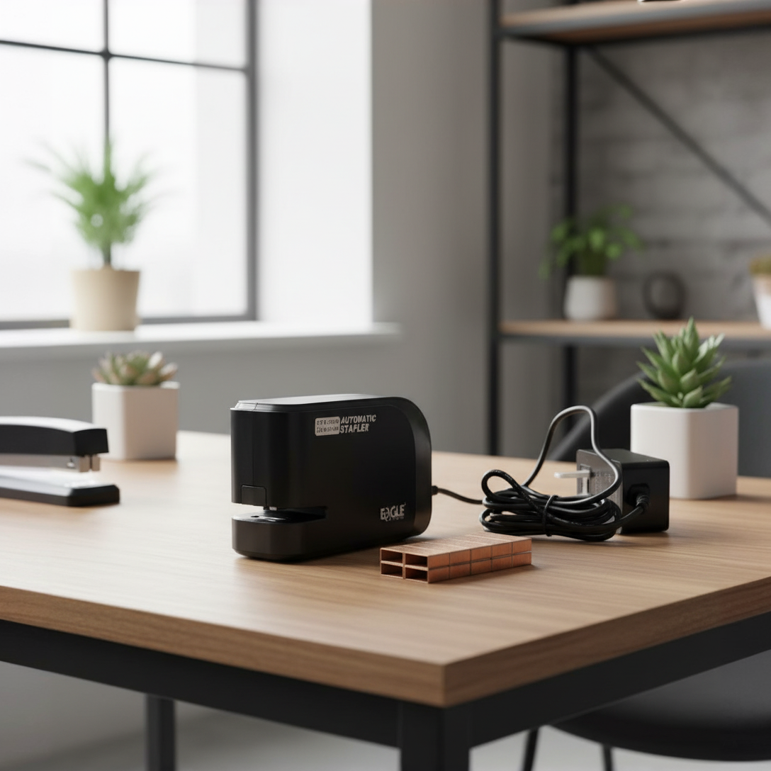 drei elektrische Heftgeräte, welche die Heftarbeit deutlich erleichtern und beschleunigen. Jedes Gerät kann entweder kabellos mit AA-Batterien oder über ein Netzteil betrieben werden. Bitte beachten Sie: Die Geräte sind mit einem US-Stecker ausgestattet. Ein passender EU-Steckdosenadapter ist nicht im Lieferumfang enthalten. Der Betrieb über Batterien ist jedoch überall sofort möglich – ganz ohne zusätzliches Zubehör.